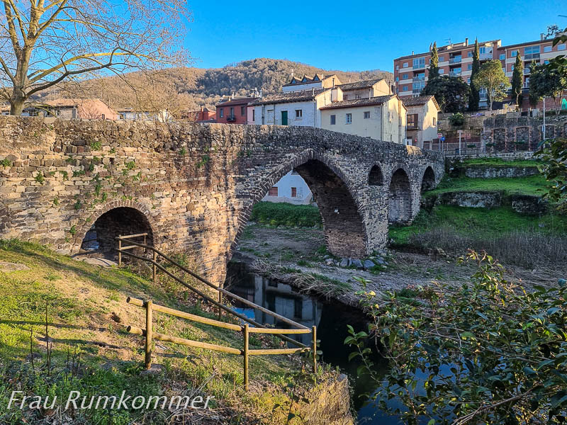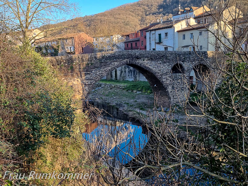 Ein recht guter Wohnmobil-Stellplatz liegt in Sichtweite der großen Kirche, die mittelalterlich aussieht. Es ist allerdings die Neue Kirche, erst etwa hundert Jahre alt. Sie thront über der sehr alten Brücke über den Fluvià. Die basiert auf einer römischen Flussquerung. Im Ort fallen einige ungewöhnliche Wandgemälde auf. Die Fronten leerstehender Geschäfte sind kreativ bunt bemalt. Auch wirklich alt ist die romanische Klosterkirche aus dem 12. Jahrhundert am Ortsrand.